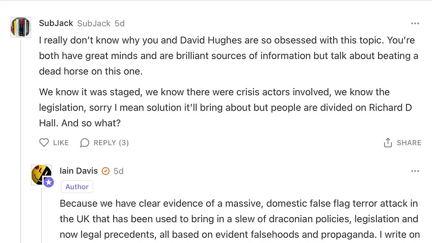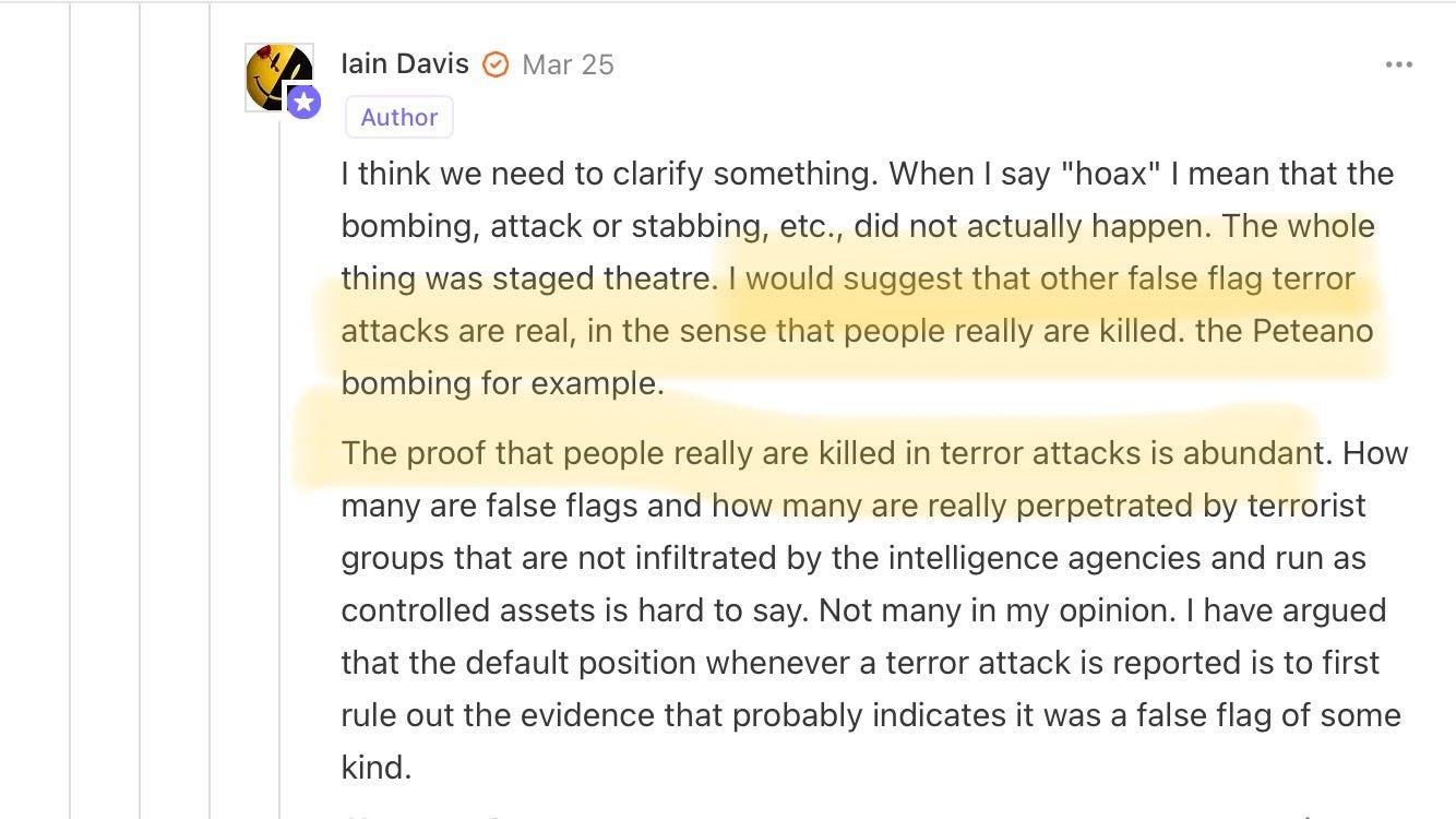 Iain Davis and David Hughes both promote the legal Psyops (Hibbert v Hall, Eve’s Law) that inevitably accompany terror hoaxes. There are more holes in these so-called “cases" than a Swiss cheese convention.