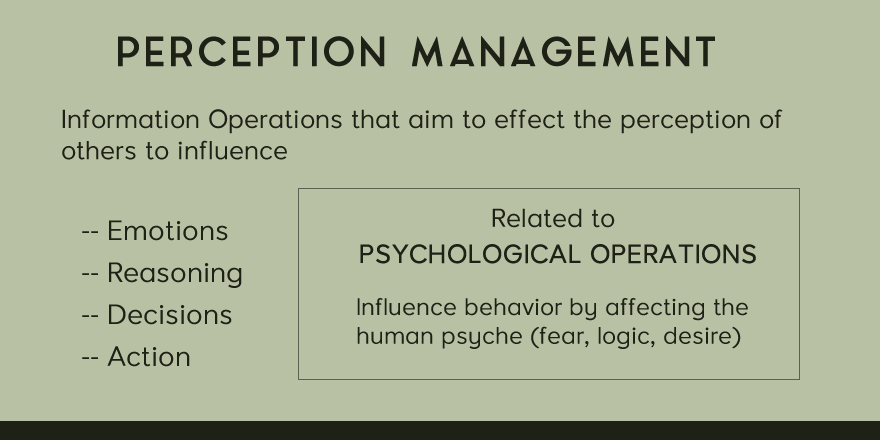 Perception management is a propaganda technique designed to alter the perceptions of a target audience: An essential component of psyops and information warfare.